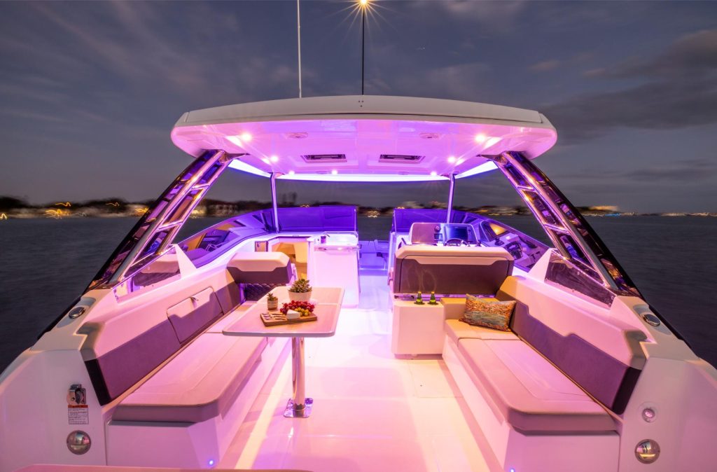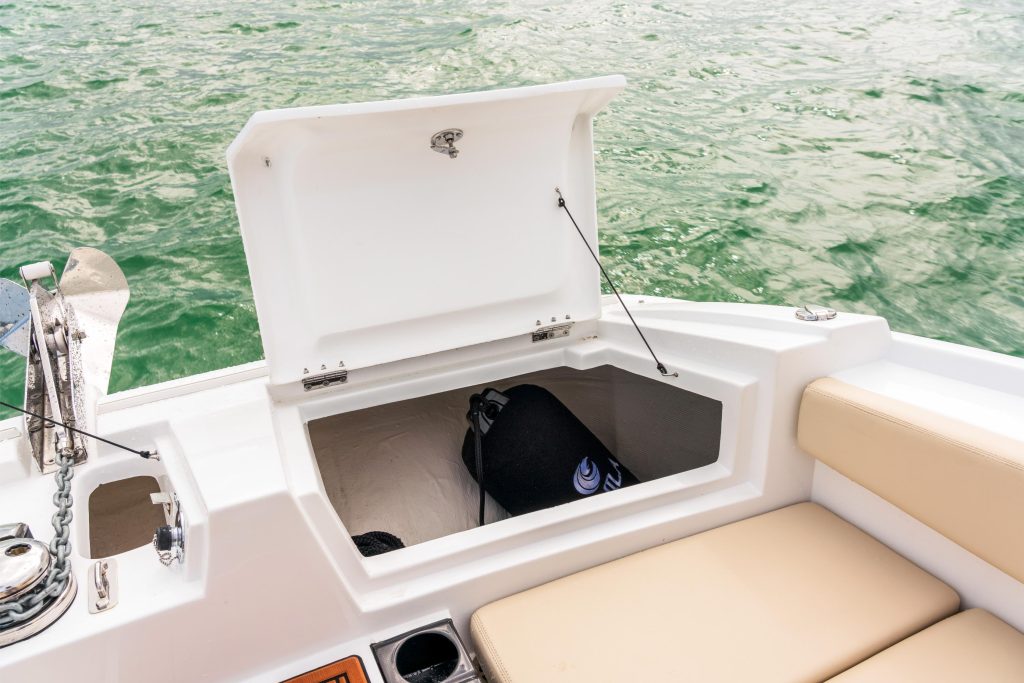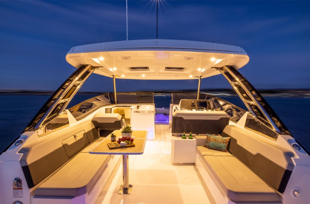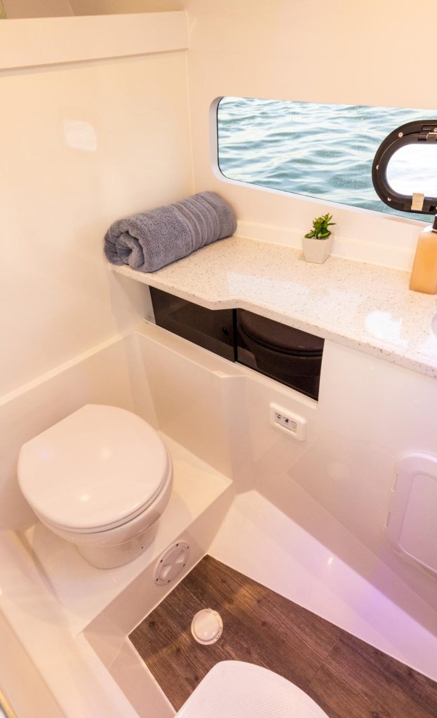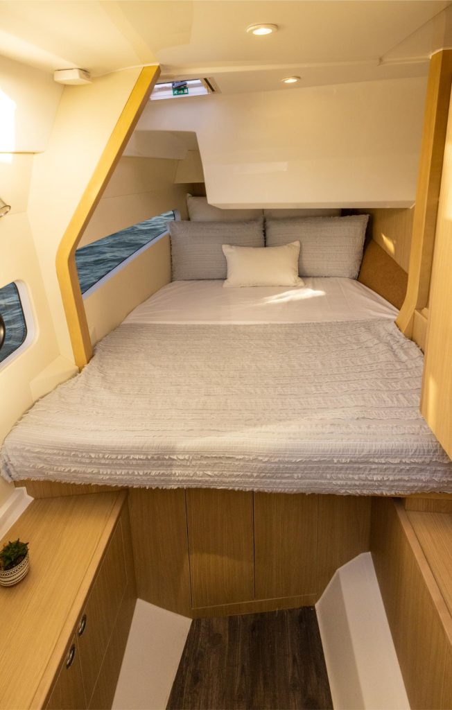 Kun seikkailu jatkuu auringonlaskun yli, hyvin varusteltu hytti tarjoaa yöpymismukavuuden, jota tämän kokoluokan veneissä harvoin näkee – varustettuna memory foam -patjalla ja omalla wc:llä. Älykkäät yksityiskohdat, kuten laajennettu uimataso, integroidut kylmälokerot ja monipuoliset säilytysratkaisut, takaavat, ettei mikään keskeytä nautintoa.