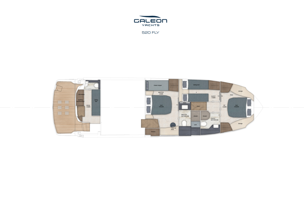Alakannella 520 FLY tarjoaa majoituksen jopa kuudelle vieraalle tasapainoisessa kolmen hytin pohjaratkaisussa. Täysleveässä omistajanhytissä on oma sisäänkäynti ja oma kylpyhuone, mikä takaa todellisen omistajatason yksityisyyden. Keulassa sijaitseva VIP-hytti tarjoaa runsaasti tilaa ja luonnonvaloa, ja kolmannessa vierashytissä on liukuva vuodejärjestelmä, jonka ansiosta hytin voi muuntaa joustavasti joko parisängyksi tai erillisiksi vuoteiksi.
