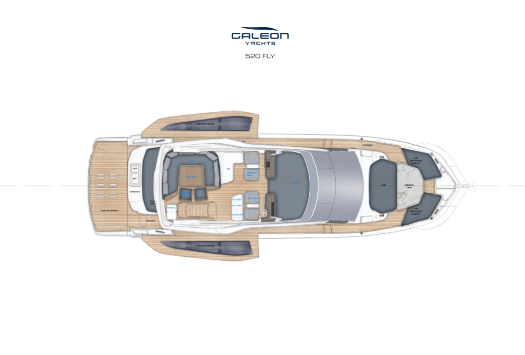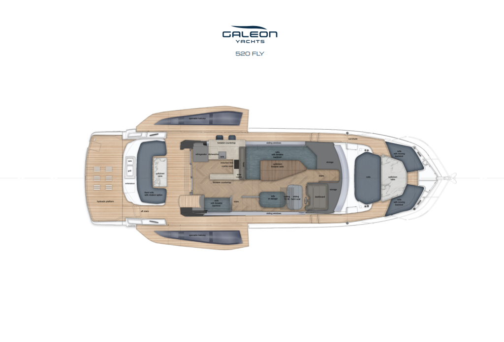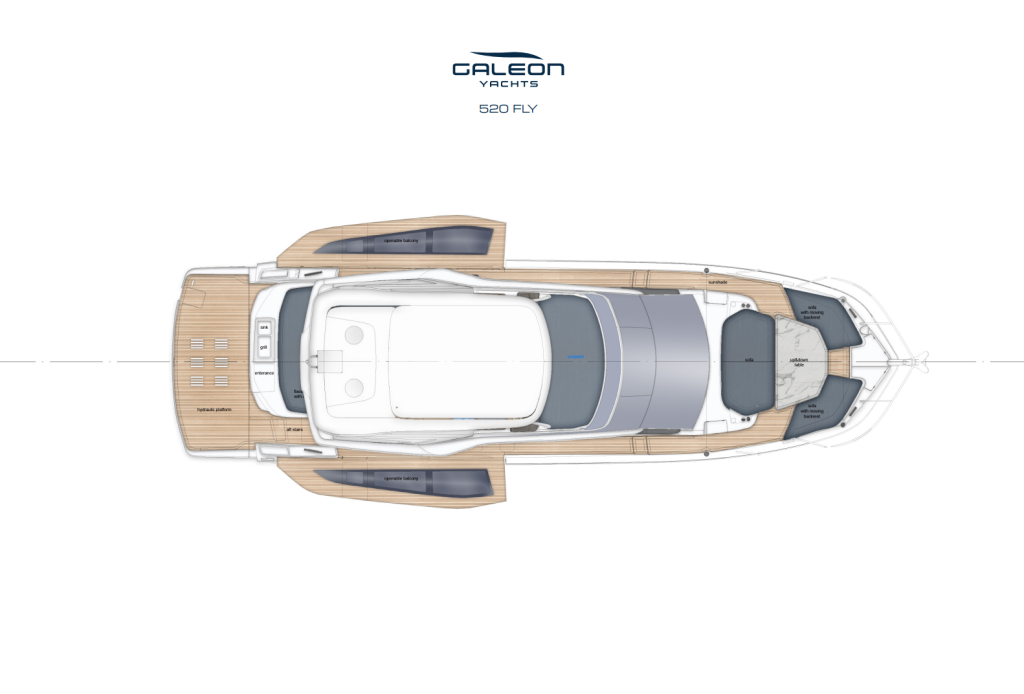 Galeon 520 FLY perustuu yhden Galeonin myydyimmän flybridge-alustan varaan, hioen ja kehittäen hyväksi todettua konseptia uuden sukupolven luksusjahdiksi. Flybridge-malliston ytimeen sijoittuva 520 FLY on suunniteltu omistajille, jotka arvostavat avaria oleskelutiloja, älykkäitä tilaratkaisuja ja hienostunutta tunnelmaa aluksella.